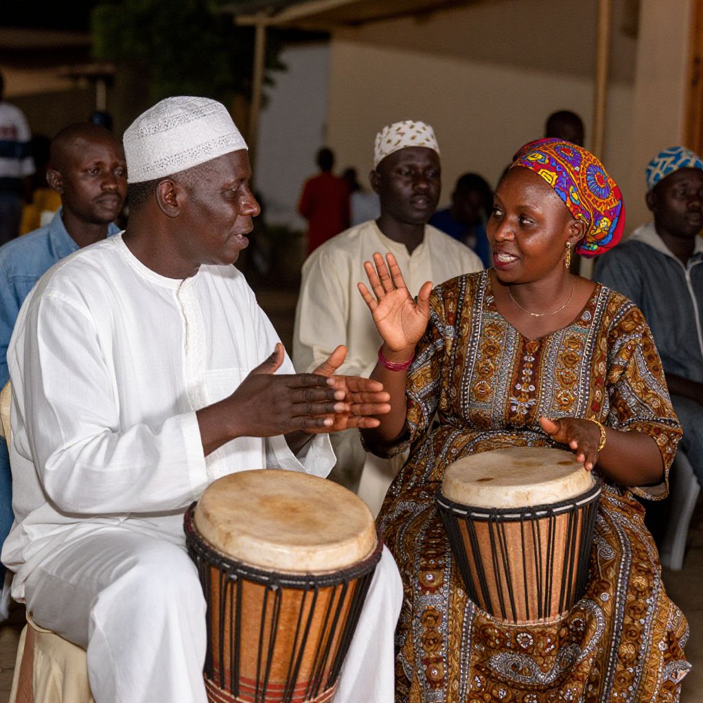 Photograph of two African musicians in traditional attire, one in white, the other in patterned dress, playing djembe drums, engaged in conversation