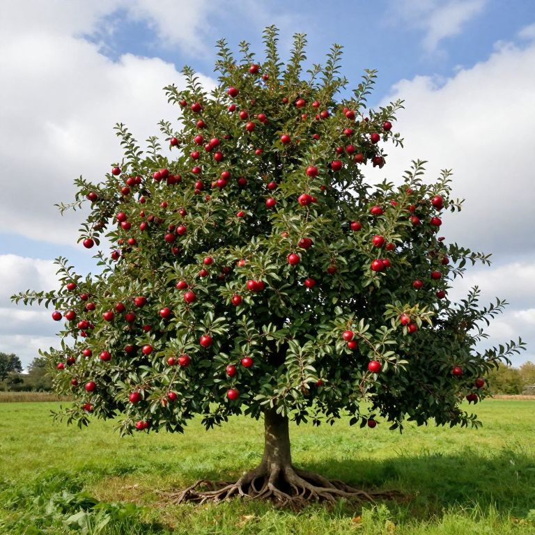 Lush apple tree laden with vibrant red fruits stands majestically in a verdant field, its sprawling roots anchoring it firmly beneath a serene sky dotted with fluffy clouds.