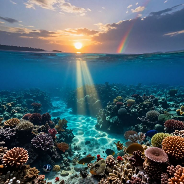 Imagine an expansive seascape at dusk, captured from beneath a glass-bottom boat in an underwater vantage point. The image seamlessly marries photorealism with digital artistry, showcasing vibrant coral gardens thriving with diverse marine fauna in a tapestry of vivid blues and greens that exude peace and fascination. As the sun descends, its golden light stretches elongated shadows across the ocean floor while distant rainbows dance on the water's surface above, encapsulating an atmosphere of both serenity and ephemeral loveliness that prompts reflection upon nature's subtle equilibrium.