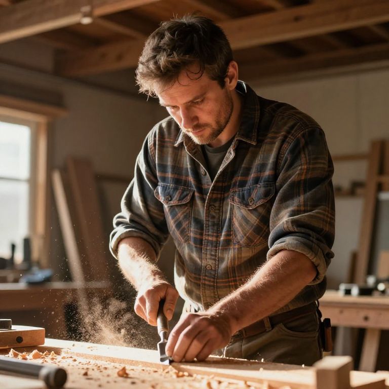 Stocky Carpenter at Work in Sunlit Workshop