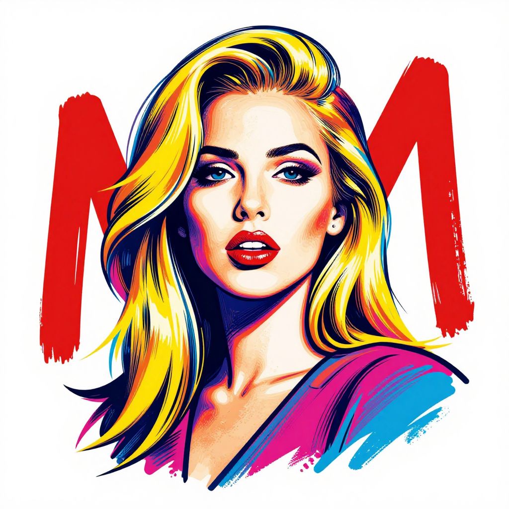 Digital pop art portrait of a blonde woman with red lips, blue eyes, and bold makeup, set against a white background with red "M" behind