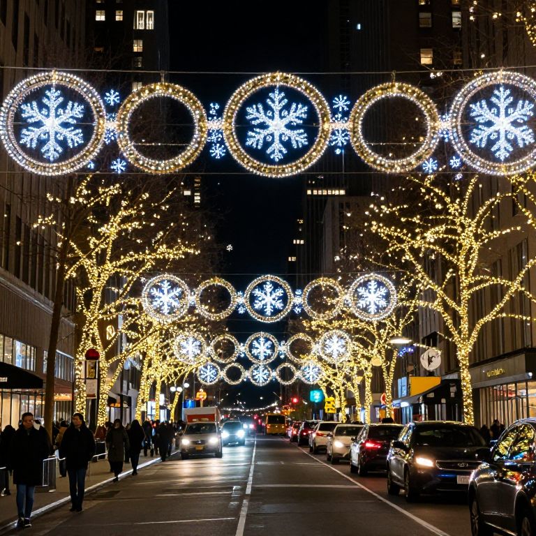 Illuminating holiday lights form a vibrant display of interconnected circles and snowflake patterns above a bustling city street in New York, New York, while warmly lit trees line both sides of the road, creating a festive atmosphere as pedestrians and vehicles navigate the scene.