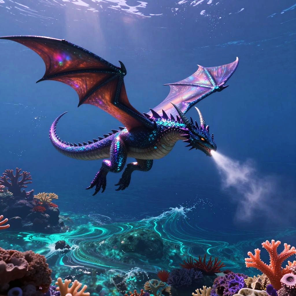 Digital artwork of a vibrant, purple-scaled dragon with glowing wings and a fiery breath, soaring above a colorful, underwater coral reef.