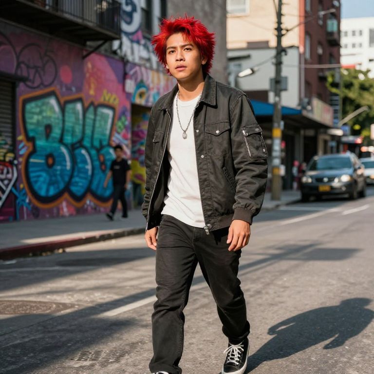 Urban street scene featuring a Filipino individual with bold red hair, dynamic city background with colorful graffiti walls, energetic atmosphere, sunlight casting dramatic shadows, casual fashion with contemporary urban vibe, rich detail and sharp focus