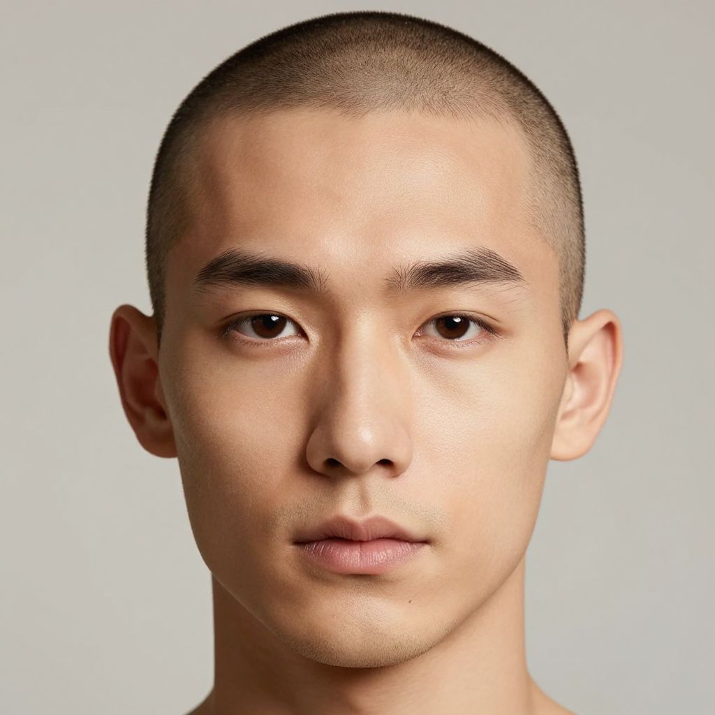 Photograph of a young, light-skinned Asian man with a close-cropped haircut, neutral expression, and subtle facial features against a plain light grey