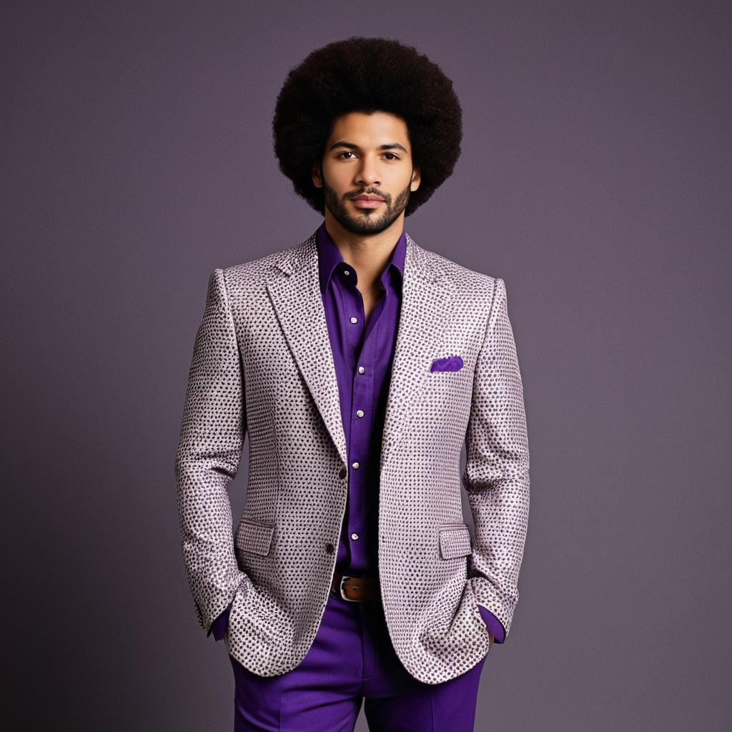 A young man with an afro hairstyle and neatly trimmed beard wearing a purple disco leisure suit. The outfit consists of a patterned light jacket, a purple shirt, and matching purple pants. He stands confidently against a simple grey background with his hands in his pockets, looking directly at the viewer.
