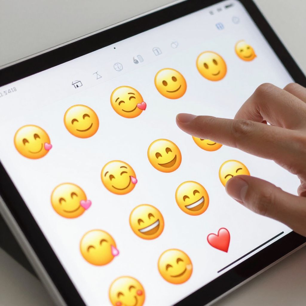 Close-up of emoji maker copy and paste tool on a sleek digital tablet, colorful emojis in progress with different facial expressions, hands interacting with the interface, modern UI design, bright and cheerful atmosphere, vector art style