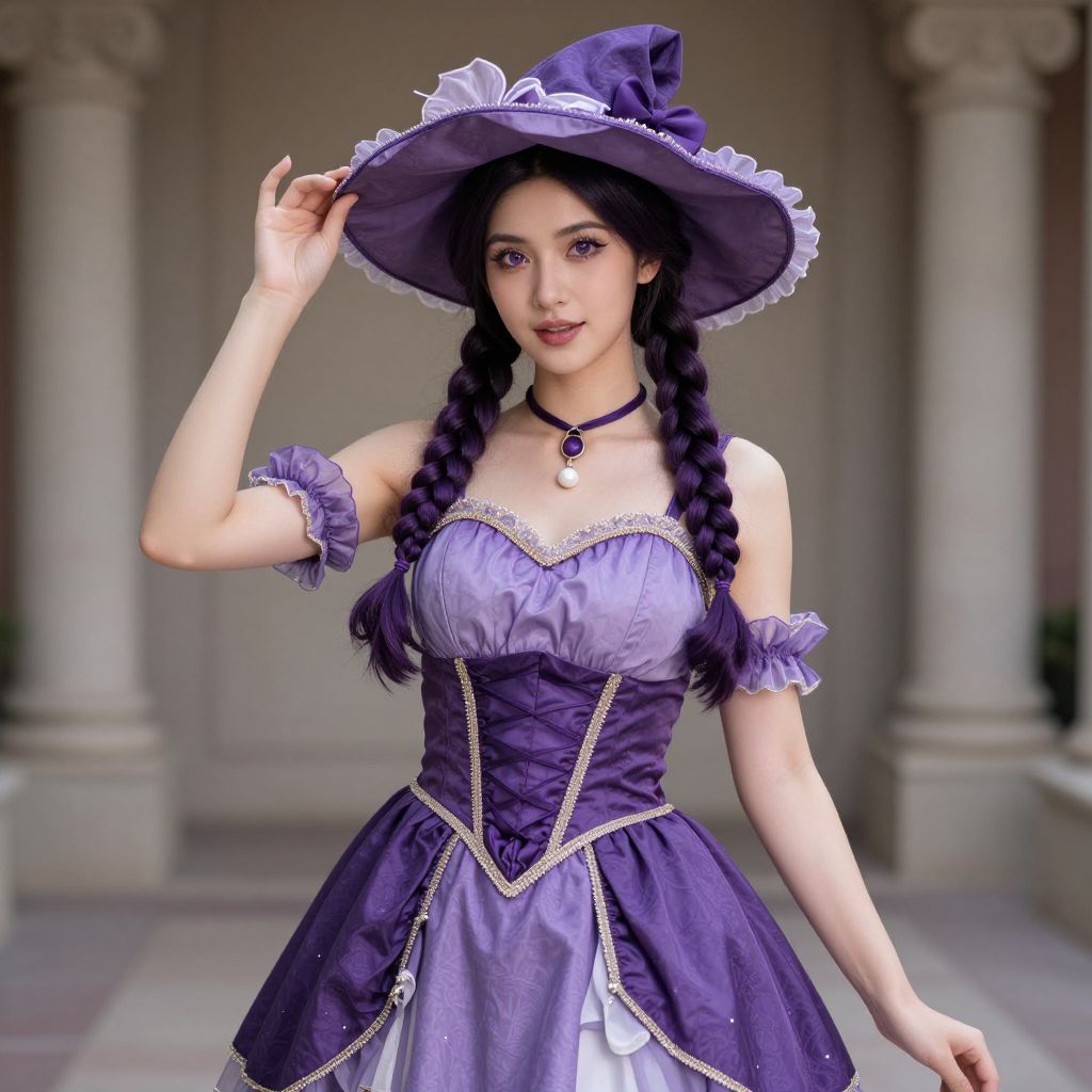 Photograph of a young woman dressed as a purple witch. She has fair skin, long black braided hair, and wears a large, floppy purple witch hat with a white lace trim. Her dress is a fitted, purple, Victorian-style gown with white lace accents, a corseted bodice, and a full skirt. She has a purple choker with a matching pendant. She holds her hat with her right hand, slightly tilting it. The background features a blurred, classical architectural setting with columns and a stone floor. The overall style is whimsical and fantasy-inspired, with a focus on vibrant purple tones.