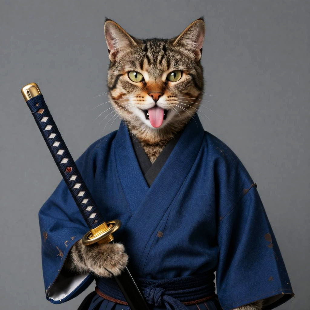 Ultra-realistic digital artwork of a tabby cat dressed as a samurai, wearing a worn indigo kimono and holding an ornate lacquered katana. The cat playfully sticks out its tongue, blending traditional Japanese warrior attire with a whimsical expression. The image showcases exquisite details in the fur, clothing texture, and katana craftsmanship, rendered in 4K resolution.