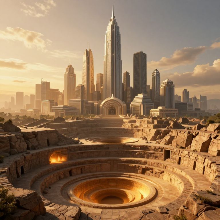A futuristic 3D-rendered cityscape rises majestically against a golden-hour sky, juxtaposed with a descending series of ancient, circular stone levels carved into the earth below, each tier illuminated by dramatic lighting that highlights the contrast between modern architecture and prehistoric depths.