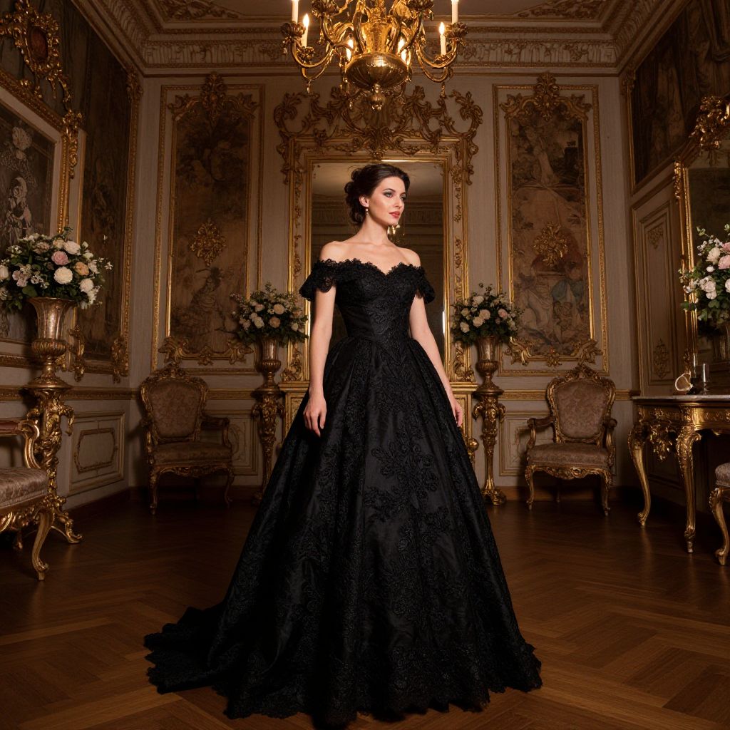 A woman dressed in an elaborate, off-the-shoulder black gown with intricate lace details stands gracefully in a richly decorated, dimly lit room reminiscent of a historic European mansion. The baroque-style interior features ornate gold accents, antique furniture, floral arrangements, and a grand chandelier, creating an atmosphere of elegance and timeless sophistication.