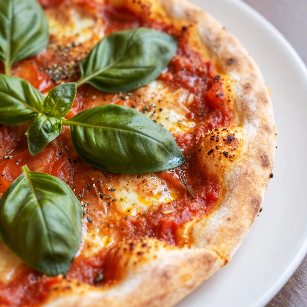 Photograph of a close-up, partially visible homemade pizza on a white plate. The pizza features a thin, slightly charred crust, topped with vibrant red tomato sauce, melted cheese, and scattered black pepper. Fresh, bright green basil leaves are arranged on the pizza's left side, adding a pop of color. The background is blurred, focusing attention on the pizza's details. The texture of the crust appears crisp, while the cheese looks creamy and the sauce is chunky. The image has a bright, natural light, highlighting the pizza's ingredients.