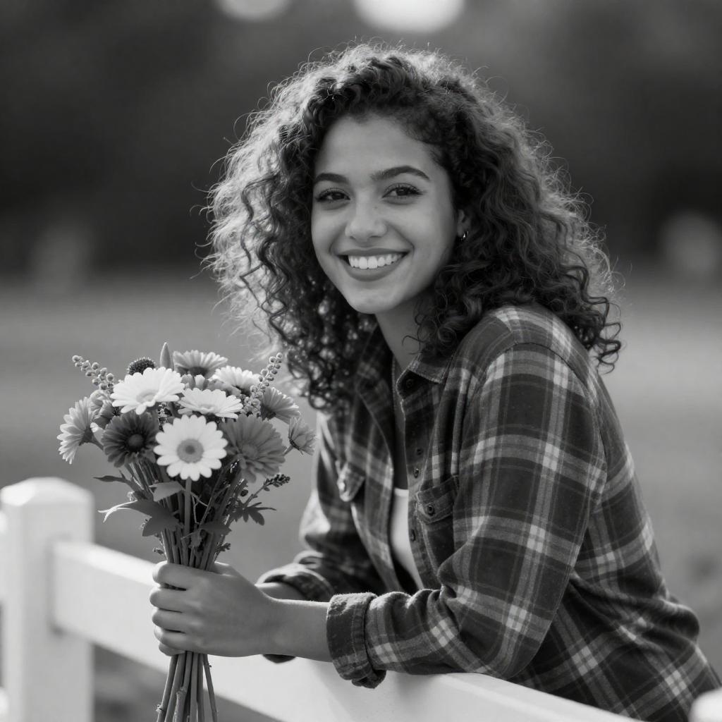 Black-and-white photograph of a smiling young woman with curly dark hair, wearing a plaid shirt, leaning on a white fence. She holds a bouquet of flowers in her right hand. Background is blurred with natural light highlighting her face.