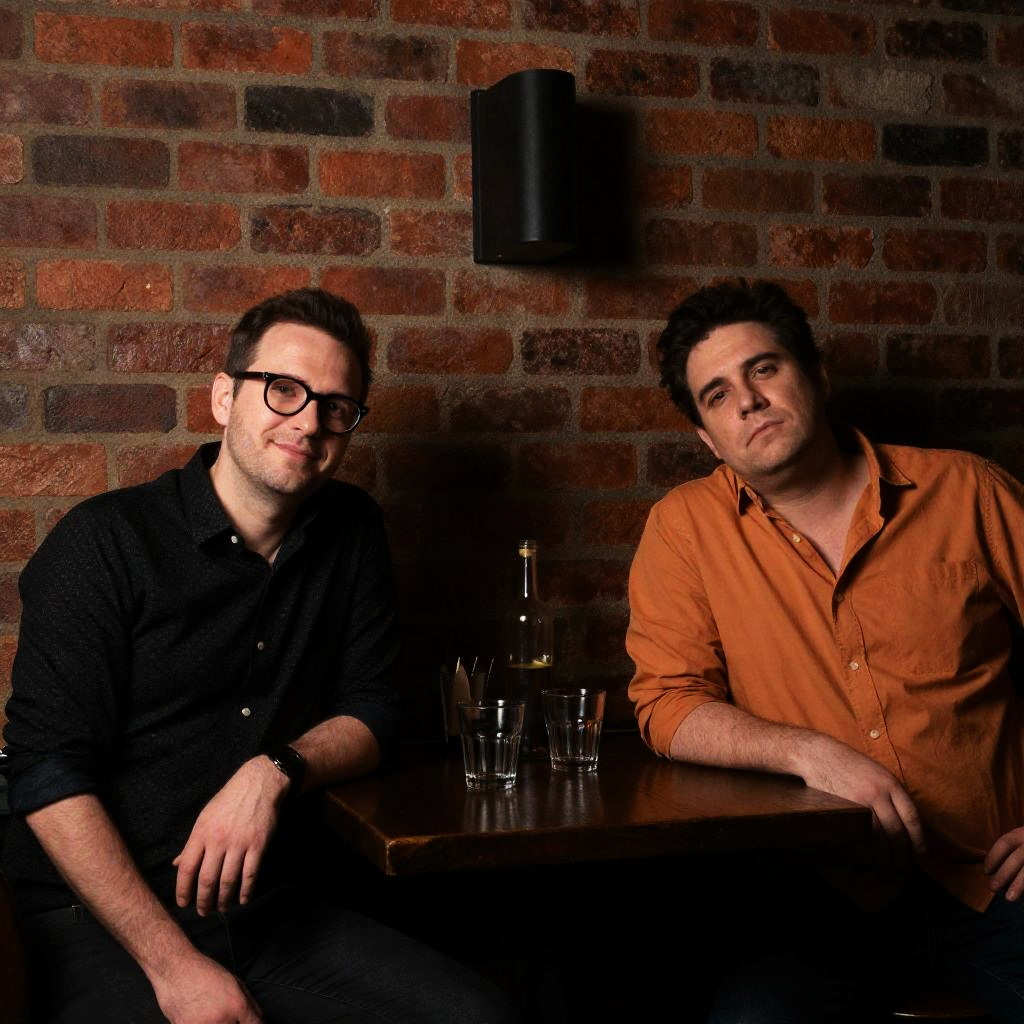 Photograph of two men at a wooden table in a dimly lit kitchen. Blonde man with glasses, black shirt, left; dark-haired man in blue shirt, right. Both hands clasped. Dark-haired man's intense gaze. Background: kitchen appliances, plants.