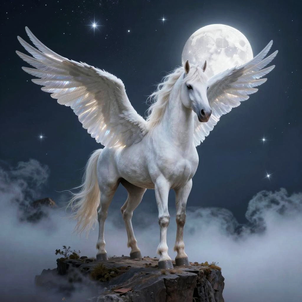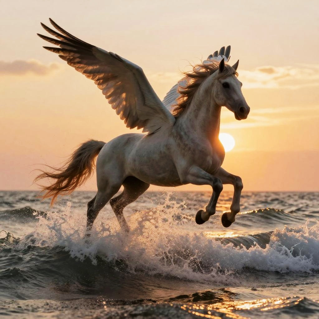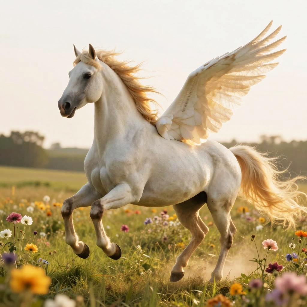Elegant Pegasus Galloping Through Meadow