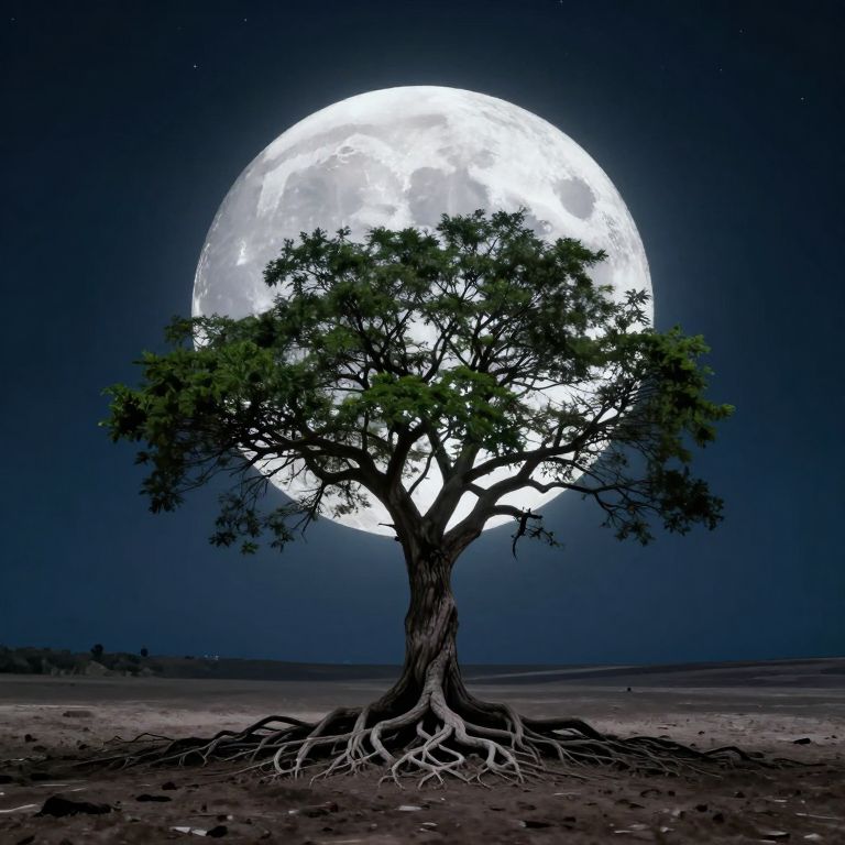 A solitary tree stands defiantly against the cosmos, its gnarled roots sprawling across a barren landscape while its lush foliage emerges directly from the luminous surface of a massive moon, defying gravity and earthly norms in a surreal dance between life and the infinite night sky.