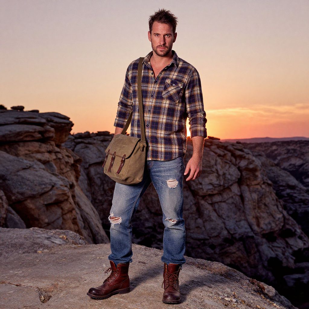 A man, casual flannel shirt, olive green puffer jacket, dark denim jeans, brown leather boots, wool blend scarf, ancient stone ruins, vibrant blue sky, polaroid instant camera style, relaxed smile. Man has masculine face and piercing eyes