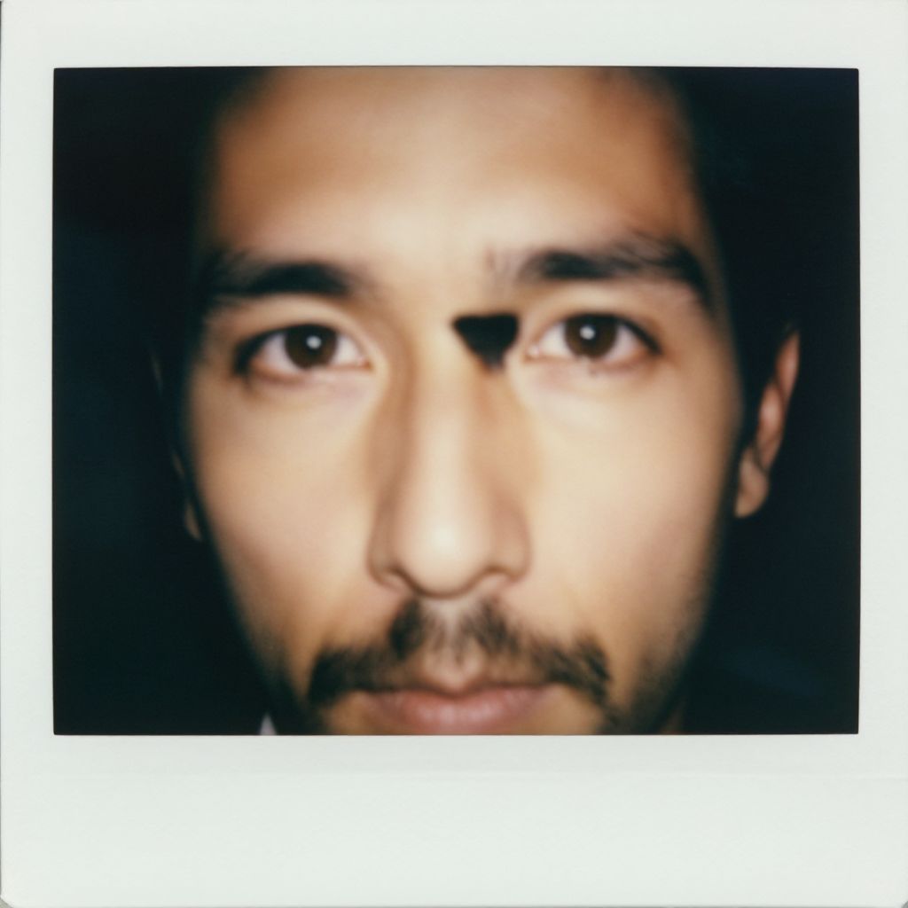 This is a digitally altered photograph of a man's face, focusing on his features. The image has a surreal effect with a black vertical line positioned between his eyebrows, creating a split face illusion. The man has medium brown skin, dark brown eyes, and a short, dark mustache. His hair is dark and slightly wavy. The background is a solid black, making the man's face the central focus. The lighting is even, highlighting his facial structure without casting harsh shadows. The overall style is modern and abstract, blending realistic elements with digital manipulation.