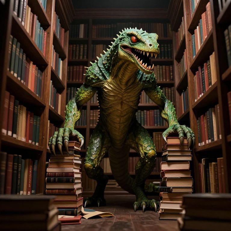 A menacing green reptilian creature stands amidst towering wooden shelves filled with countless books, its sharp teeth bared and claws gripping stacks of scattered volumes in a dimly lit library.