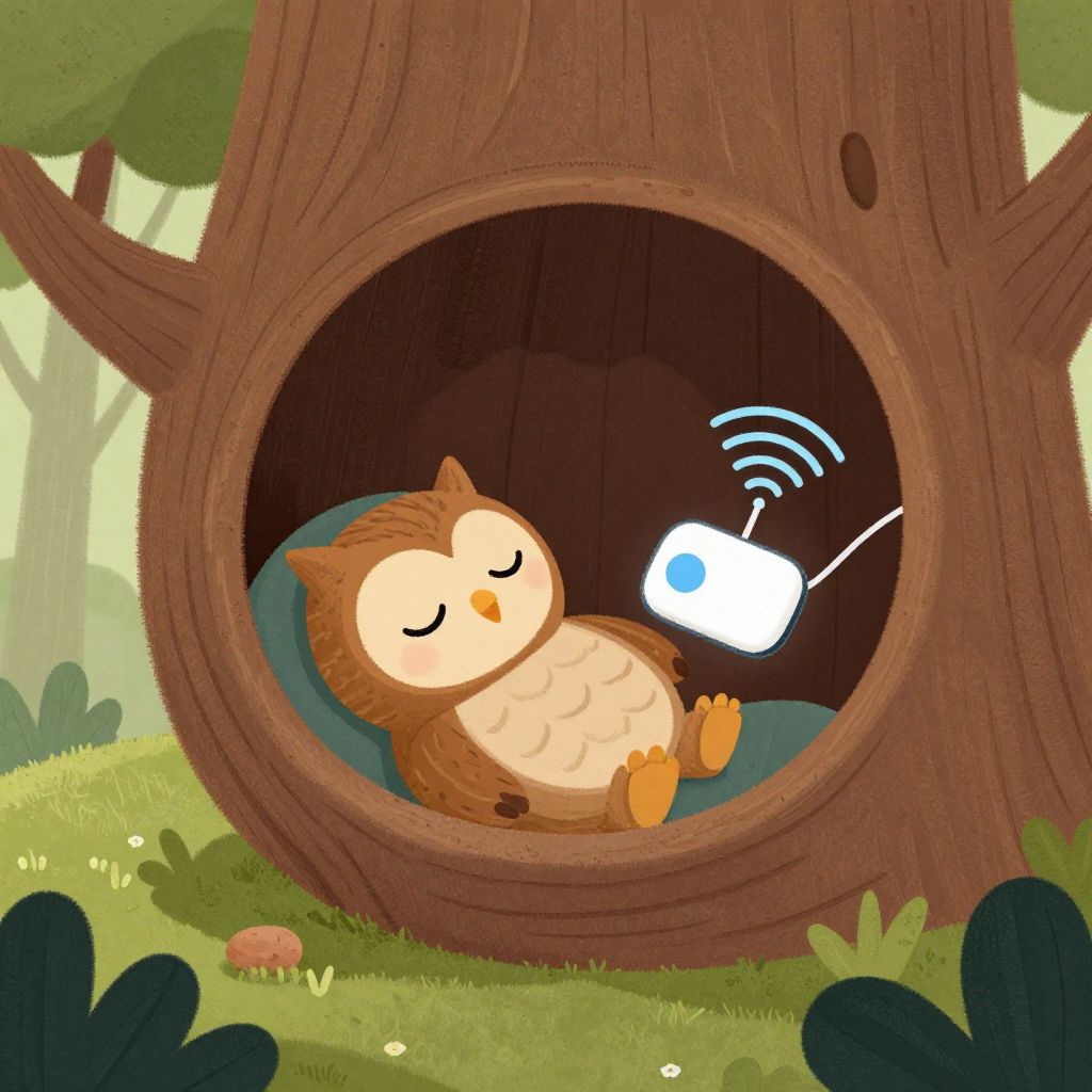 Cartoon owl with closed eyes and brown feathers napping in hollow tree, listening to a white, glowing music player. Forest background.