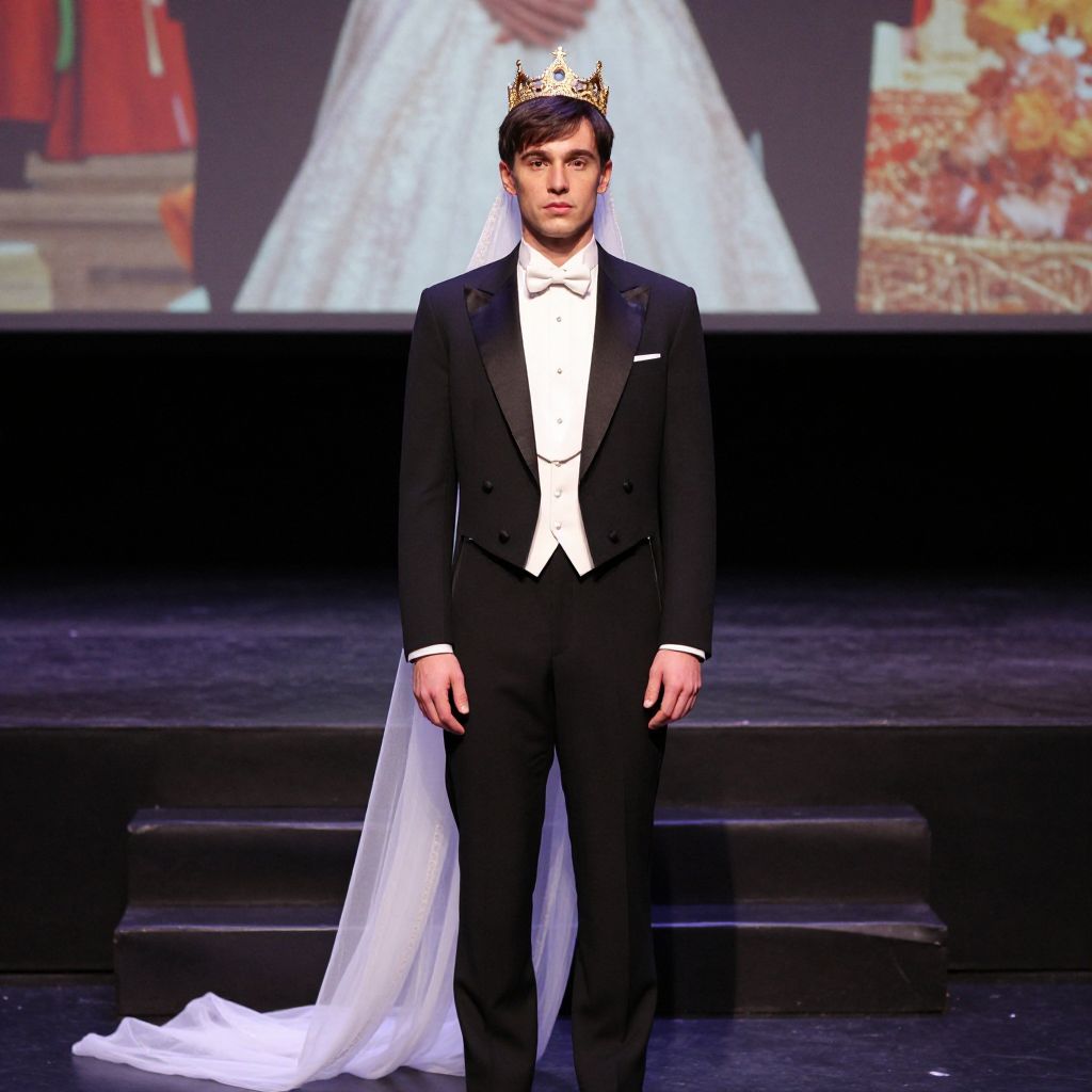 Male Bride Stag Costume, dressed in a tuxedo and a crown standing in front of a stage
