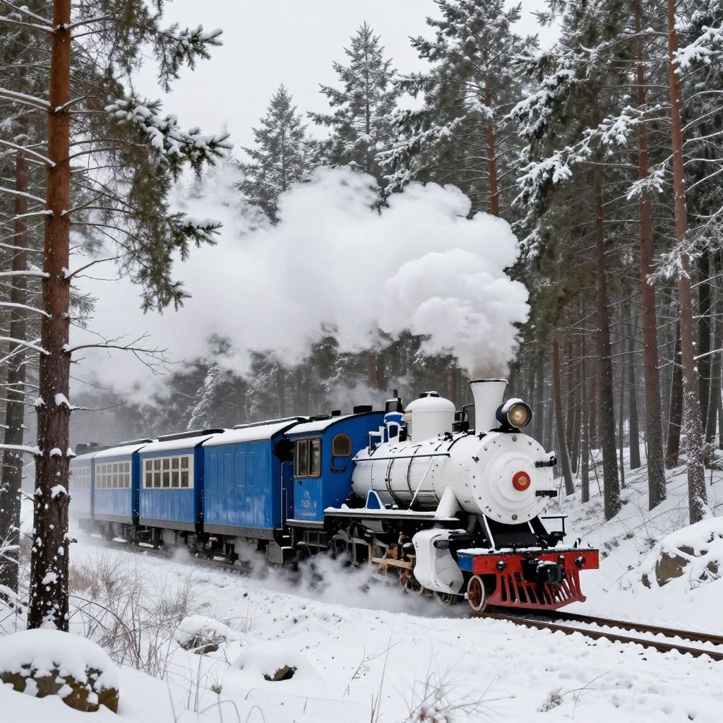 A vintage steam train painted in blue and white traveling through a dense forest covered with fresh snow. The scene features tall pine trees dusted with snow and a thick plume of white steam rising from the engine, creating a serene winter landscape.