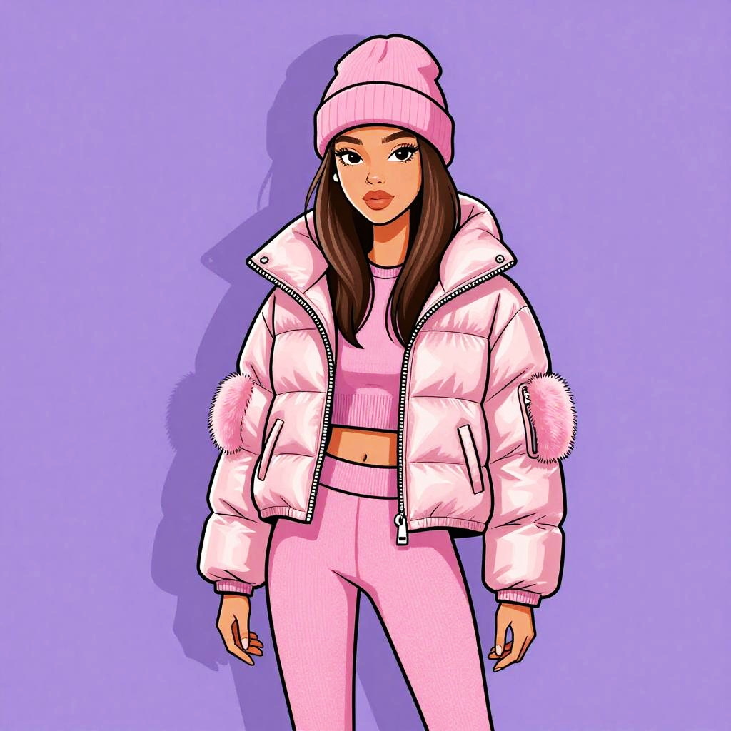 Woman with pretty face and pretty hair. Woman, modern winter chic, glossy metallic pink puffer jacket with oversized collar, matching pink beanie, coordinating faux fur muff, slim-fit textured leggings in a lighter pink shade, photo studio background. --sref 1467