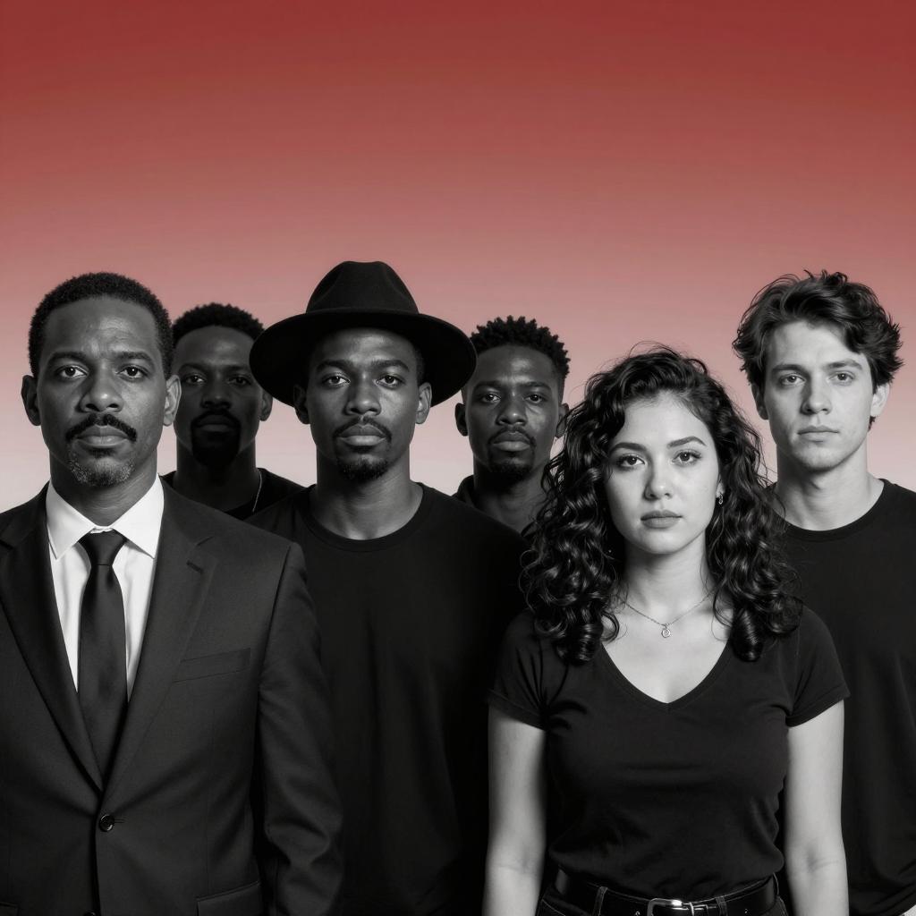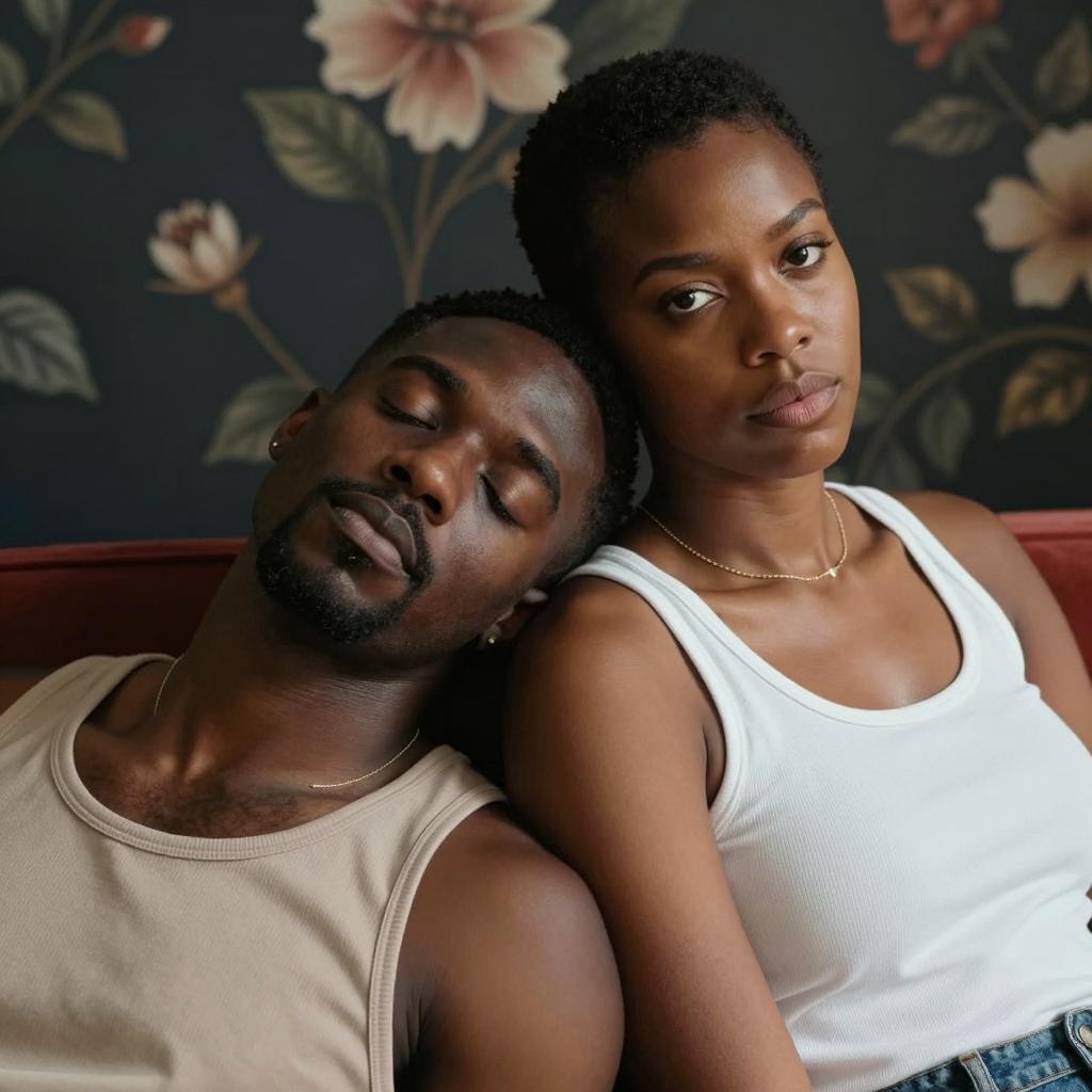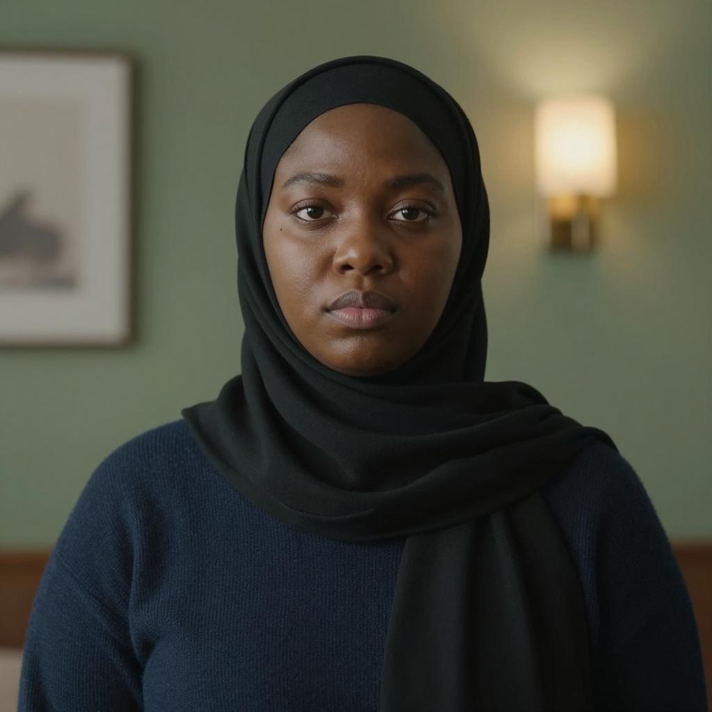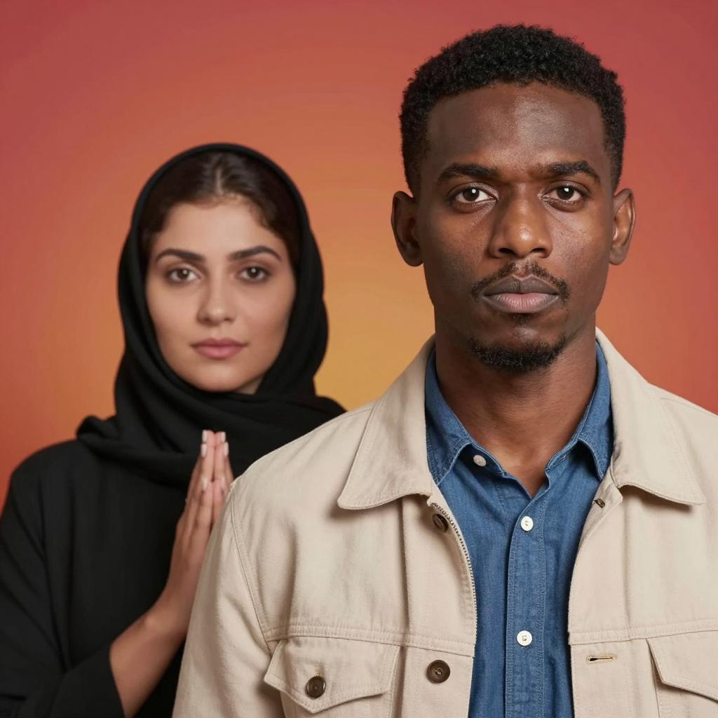 Portrait of a serious dark-skinned man wearing a beige jacket over a blue shirt standing in the foreground. Behind him, a light brown-skinned woman wearing a black headscarf with clasped hands and a gentle expression. The background features a vibrant red and orange gradient, with the woman slightly out of focus.