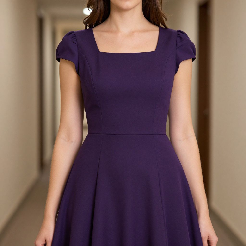 Photograph of a woman standing in a narrow, dimly lit hallway with beige walls and a brown door on the right. She has light skin and long, dark brown hair. She is wearing a fitted, knee-length, navy blue dress with short, slightly puffed sleeves and a square neckline. The dress has a subtle waistline that accentuates her slender figure. Her arms hang naturally by her sides. The background is slightly blurred, drawing focus to the dress. The lighting is soft, highlighting the smooth texture of the fabric. The image has a realistic style.