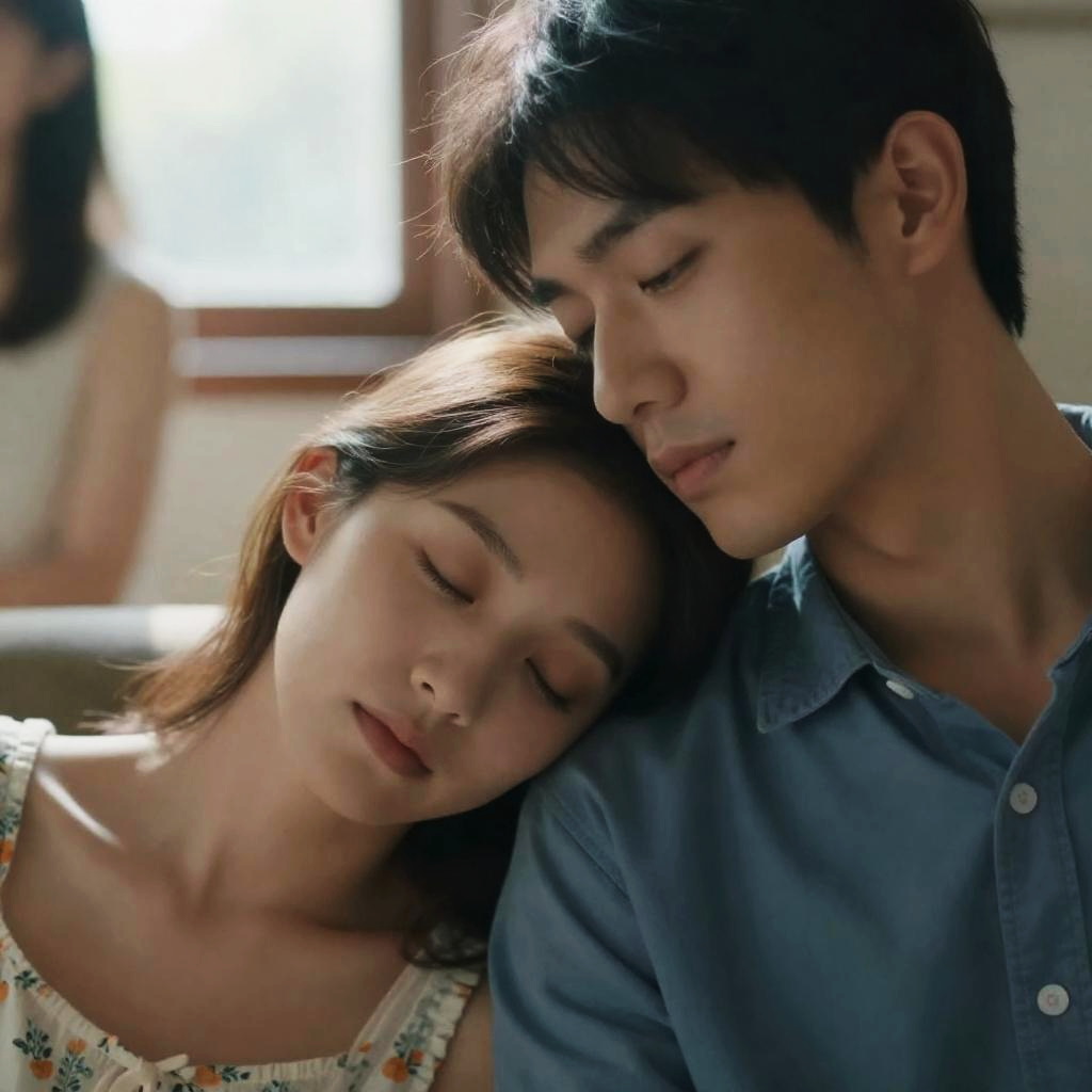 Photograph of a man and woman on a brown leather couch. Woman in bright pink pajamas, reclining with eyes half-closed, arm resting on man's shoulder. Man in white tank top, gray pants, sitting behind her, arm around her shoulder, serious expression. Dimly lit living room with a modern floor lamp in the background.