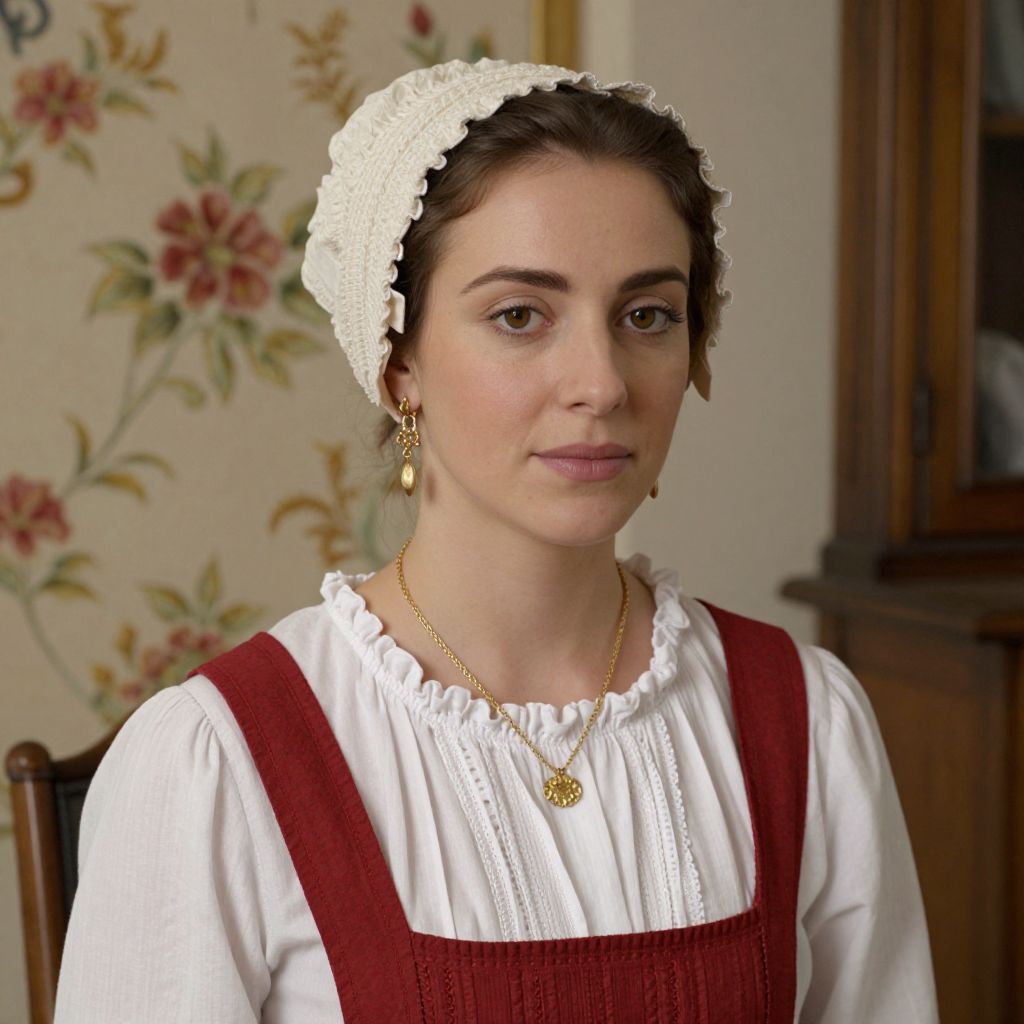 Woman wearing a historical costume with a cream-colored bonnet, ruffled blouse, and red pinafore, accessorized with a gold necklace and earrings, set against a softly lit background featuring a floral-patterned wall and wooden furniture.