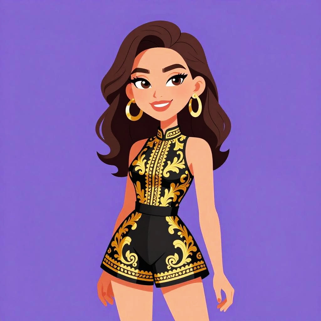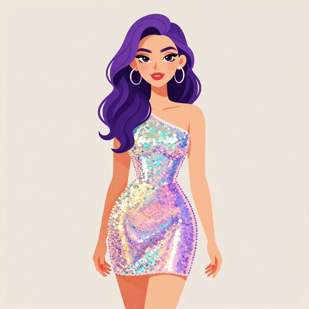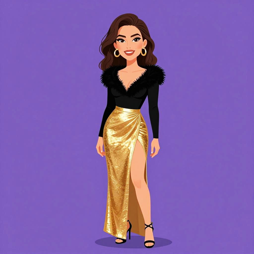 Digital illustration of a confident woman with medium-length dark brown hair, wearing large hoop earrings. She has a light skin tone and is smiling with red lipstick. She is dressed in a gold sequin bikini top and matching high-waisted shorts, both adorned with glittery patterns. Her top has long, sheer, fishnet sleeves. The background is a solid purple color, making her golden outfit stand out. The image has a vibrant, cartoonish style with bold colors and smooth lines.