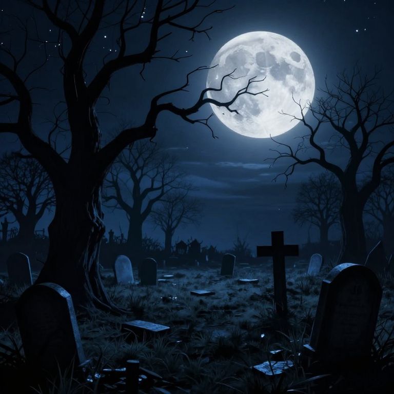 Moonlit graveyard with bare, twisted trees; bright full moon casting eerie blue light on gravestones and a cross in the foreground.