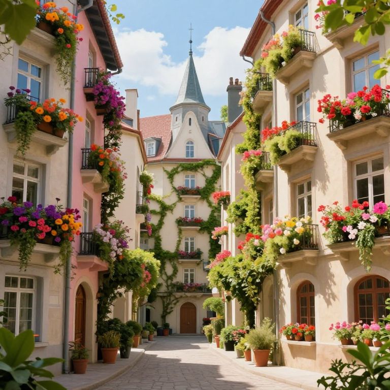 In this enchanted cityscape, where architecture seamlessly blends with nature, vibrant blooms cascade from windows like living tapestries, inviting a meditative journey through serenity and renewal, where each step whispers the promise of hope and the timeless rhythm of life.