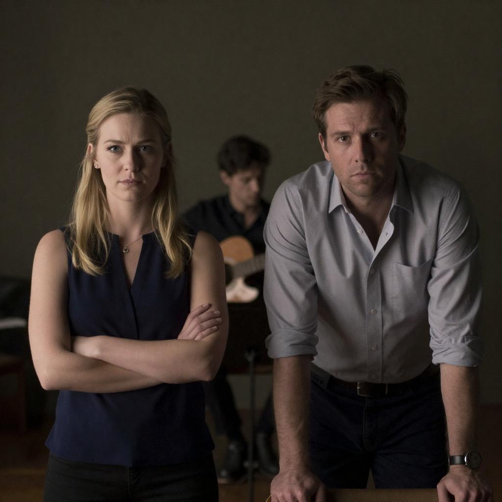 Photograph of a dimly lit room with two people in the foreground. A blonde woman with a serious expression, wearing a sleeveless navy blue top, stands with arms crossed. A man with short brown hair, wearing a light gray shirt and dark pants, leans forward with hands on a chair. A blurred musician with a guitar is in the background.