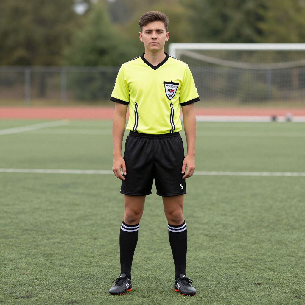 Soccer ref costume, 1boy, male focus, solo, sportswear, realistic, sneakers, full body, socks, shoes, shorts, standing, outdoors