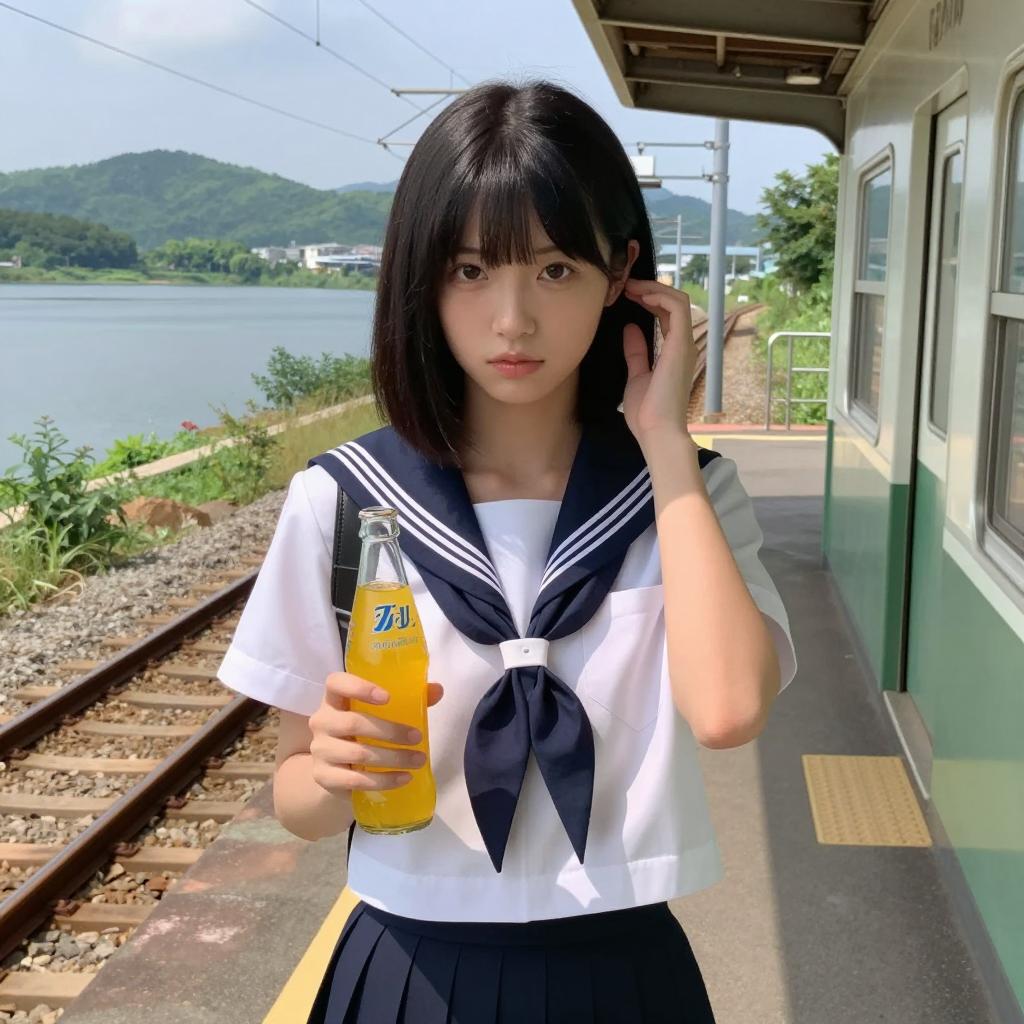 Portrait of an Asian woman with long black hair and bangs, fair skin, wearing a white sailor-style shirt with navy blue accents. She is eating a pink and green watermelon-shaped popsicle while looking directly at the camera. The background shows an outdoor shop with glass display cases containing food items and a refrigerator with a red Coca-Cola sign. The scene is lit by natural daylight.