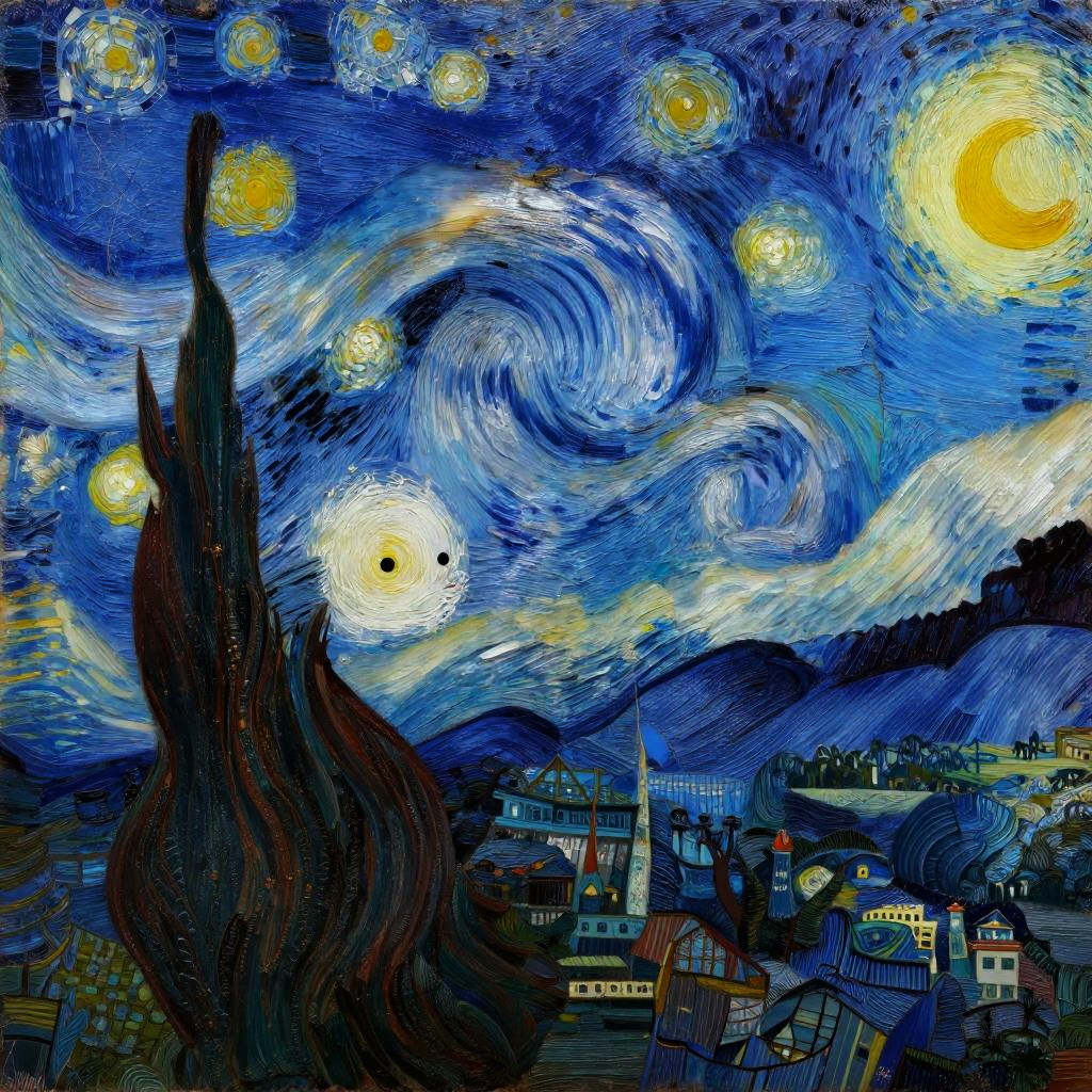 Fine art, oil painting, best quality, dark tales, Athens in the Van Gogh style, starry night, Dan Mumford, Andy Kehoe, Yuko Shimizu, 2d, flat, cute, adorable, vintage, art on a cracked paper, patchwork, stained glass, fairytale, storybook detailed illustration, cinematic, ultra highly detailed, tiny details, beautiful details, mystical, luminism, vibrant colors, complex background