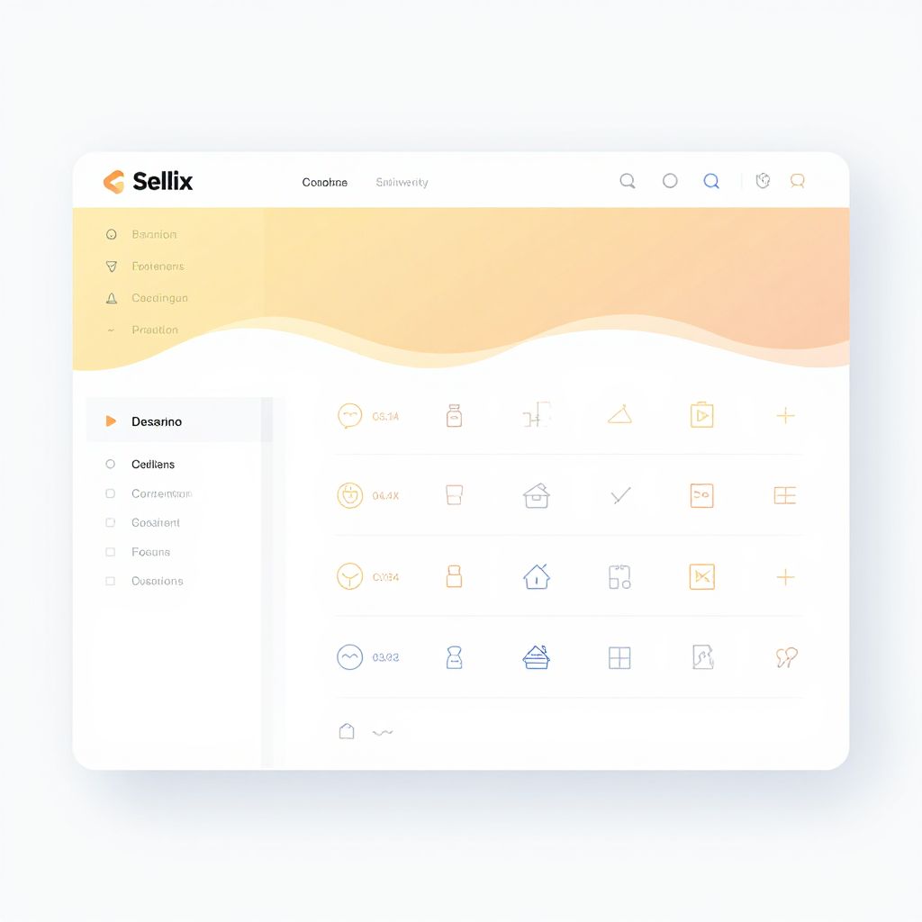 Sellix theme ecommerce dashboard, bright and clean UI, intuitive navigation panels with pastel color palette, flat design elements, smooth gradients, wireframe style icons, professional and elegant digital storefront, high detail, vector style.