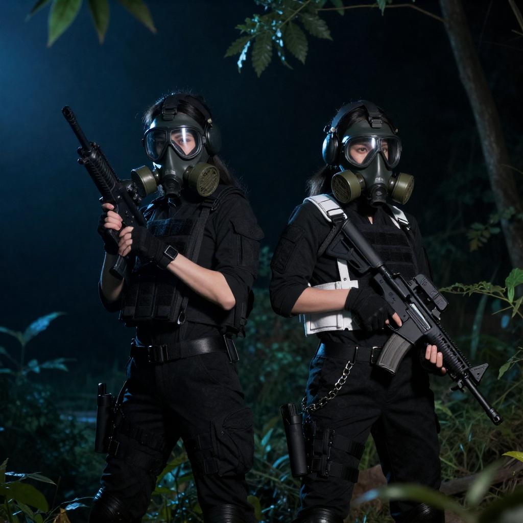 Two women in black tactical clothing and gas masks holding rifles stand in a dark forest environment. One wears black tactical harnesses while the other wears white. The setting features dense foliage and dramatic blue and green lighting, creating an intense and mysterious atmosphere.