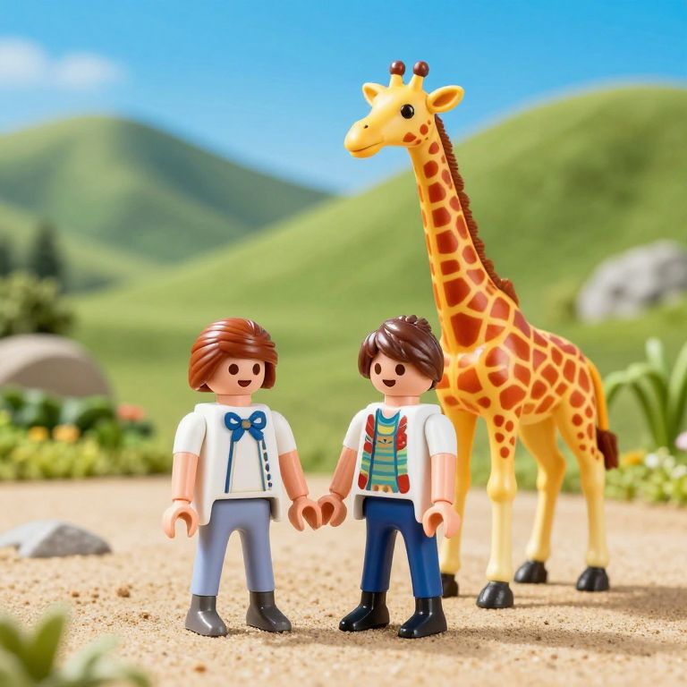 Two Playmobil figures stand hand-in-hand on a sandy path, accompanied by a vibrant orange giraffe, set against a backdrop of lush green hills and a clear blue sky.
