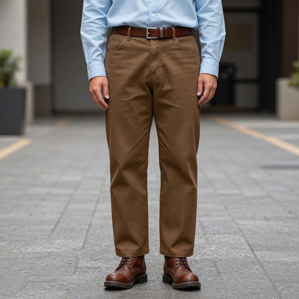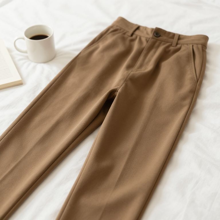 Relaxed fit trousers laying on a bed, slightly wrinkled, with a coffee mug and a book nearby, soft focus, warm tones, realistic lifestyle photography.