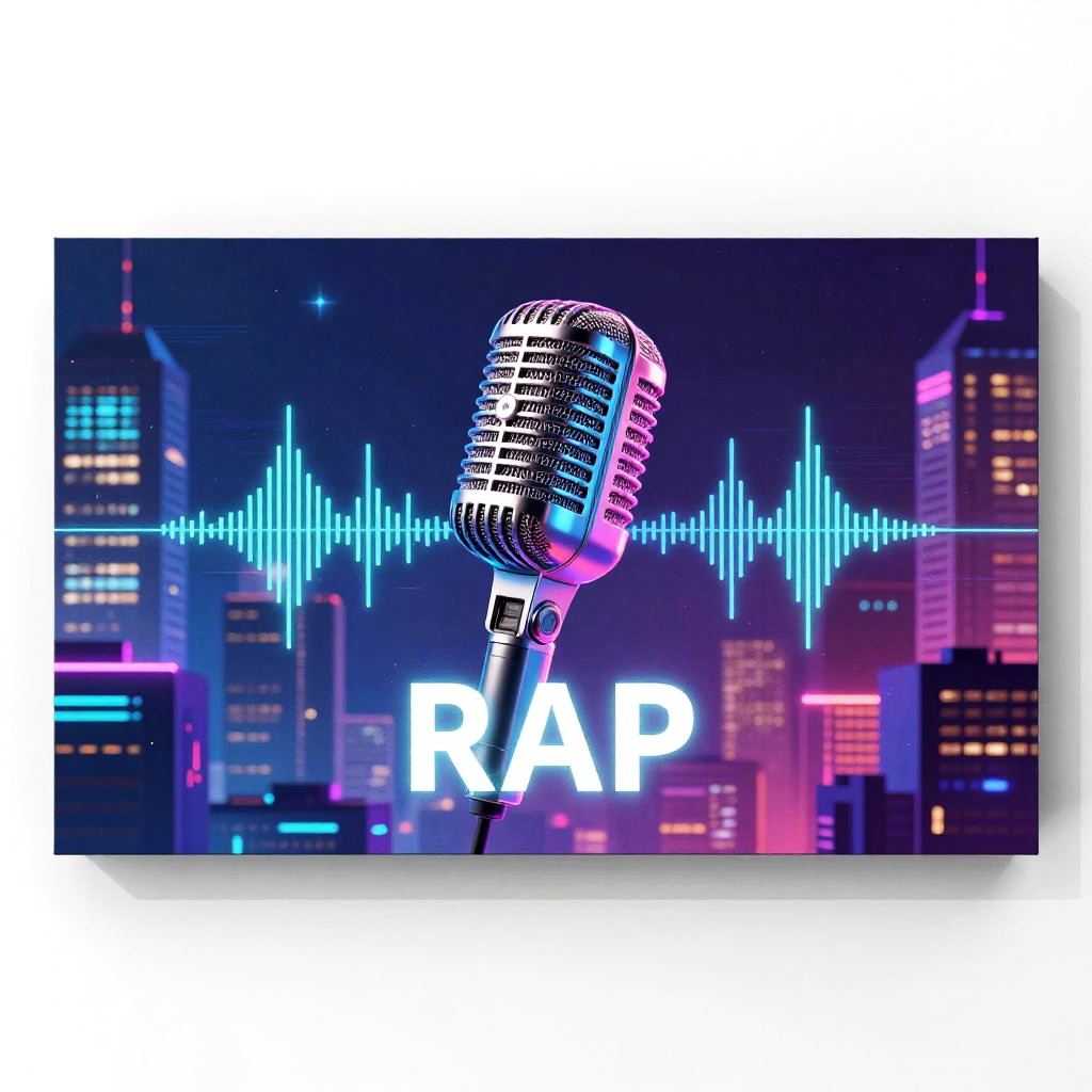 Rap YouTube banner displaying a futuristic cityscape with a holographic microphone and rhythmic soundwaves pulsing through the background, sleek neon colors and digital glitch effects, blending urban culture and modern tech vibes.