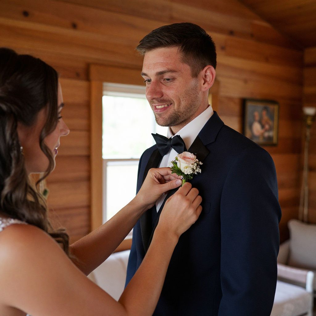 Groom Getting Boutonnière in Cabin