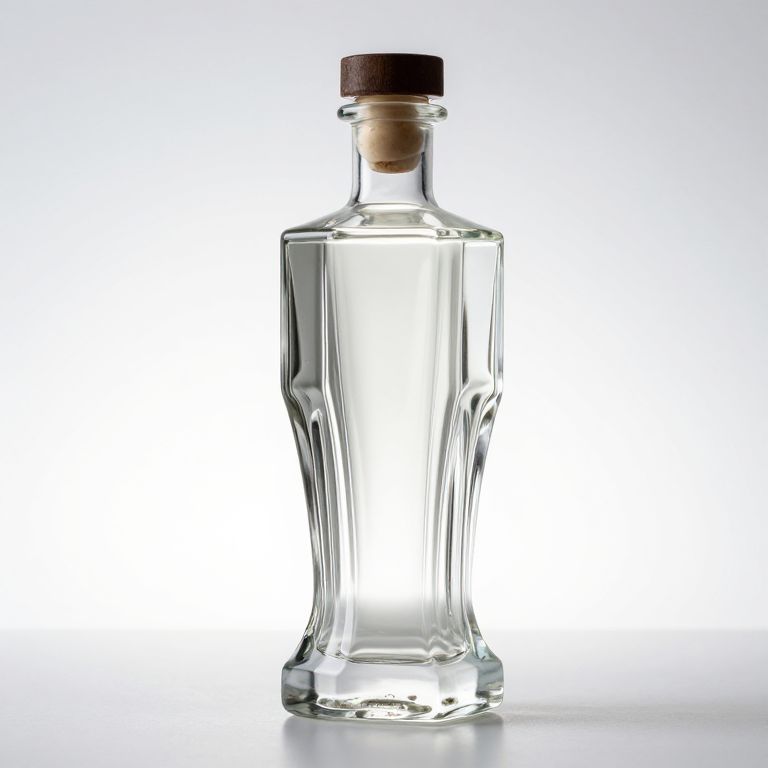 Photograph of a clear, rectangular glass bottle with vertical ridges and a wide base, topped with a dark brown cork stopper. The bottle is centered against a pure white background, creating a high-contrast, minimalist setting that emphasizes the transparency and geometric shape of the glass. The bottle's surface reflects light, adding a slight sparkle to its otherwise smooth texture. The cork has a slightly rough texture, contrasting with the sleek, polished glass. The overall composition is clean and modern, highlighting the bottle's simple elegance.