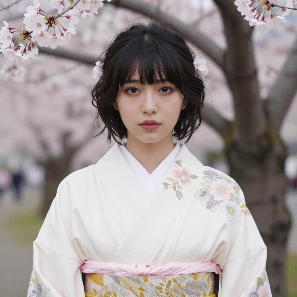 Photograph of an East Asian woman with fair skin and straight black hair wearing a traditional white kimono with a hood. She has a neutral expression and is adorned with a pink and gold-patterned obi sash. Cherry blossoms in the background create a soft, blurred effect, adding a delicate and serene atmosphere. The woman is centered in the frame, with the cherry blossom branches framing her head from above. The overall composition emphasizes traditional Japanese aesthetics and cultural elements.