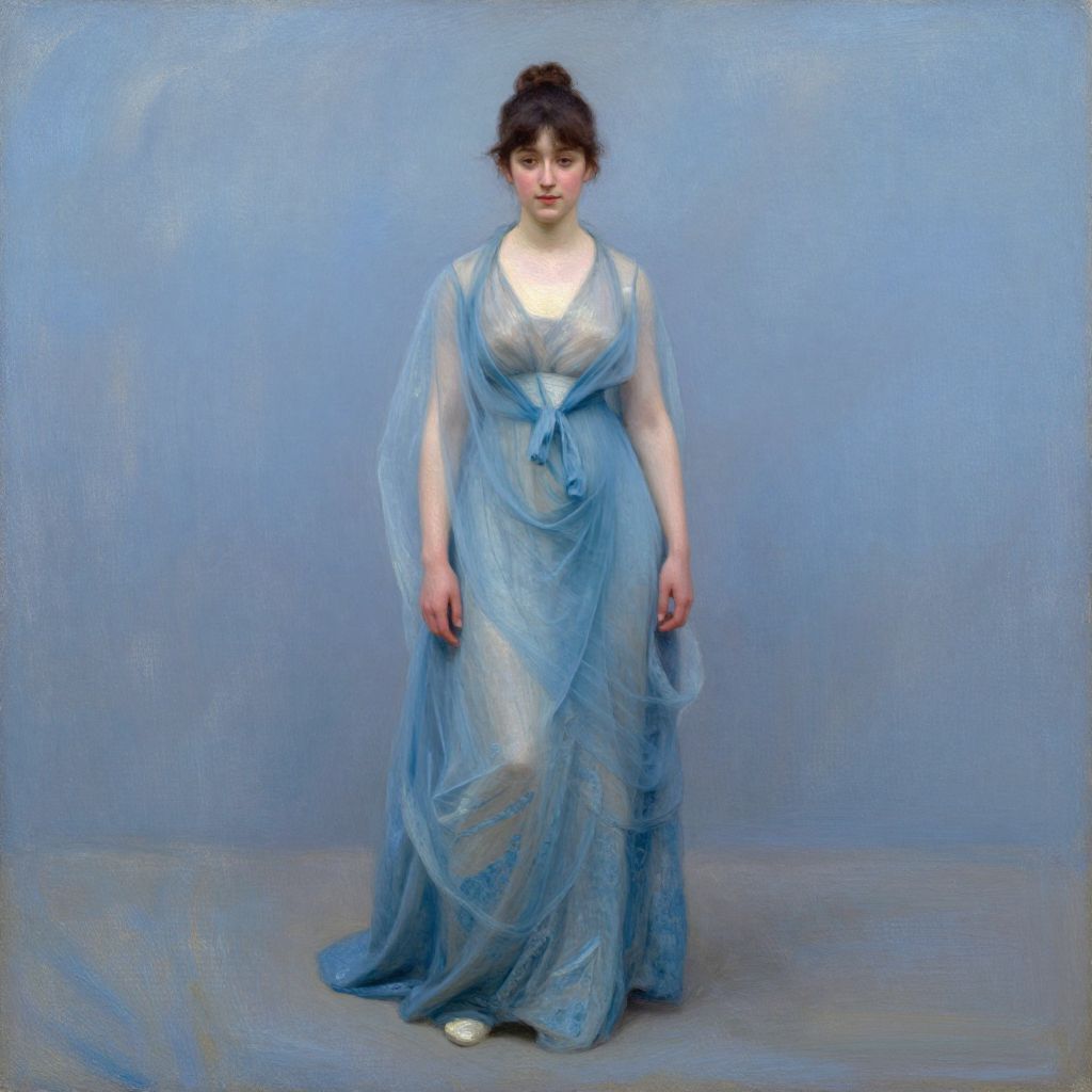 This is a digital painting in a realistic style of a young Caucasian woman with fair skin and dark brown, slightly wavy hair tied in a loose updo. She has a soft, round face with a subtle, serious expression. She is wearing a sheer, blue, flowing dress that reveals a white undergarment beneath, with delicate blue ties at the center of the chest and shoulders. The background is a smooth gradient of blue shades, emphasizing the subject. The texture of the painting is smooth with visible brushstrokes, particularly in the fabric of the dress. The woman stands slightly to the left, looking directly at the viewer.