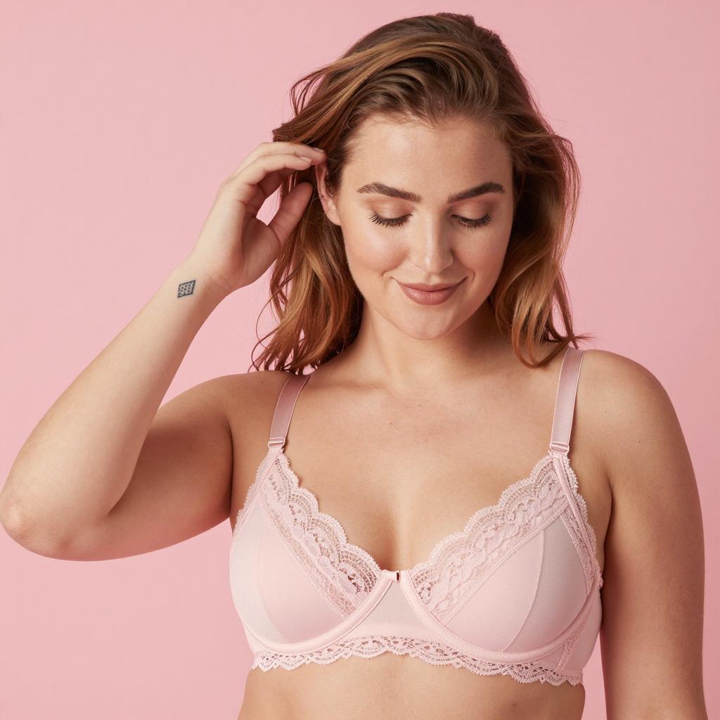 Young Woman in Beige Lace Bra with Pink Cardigan