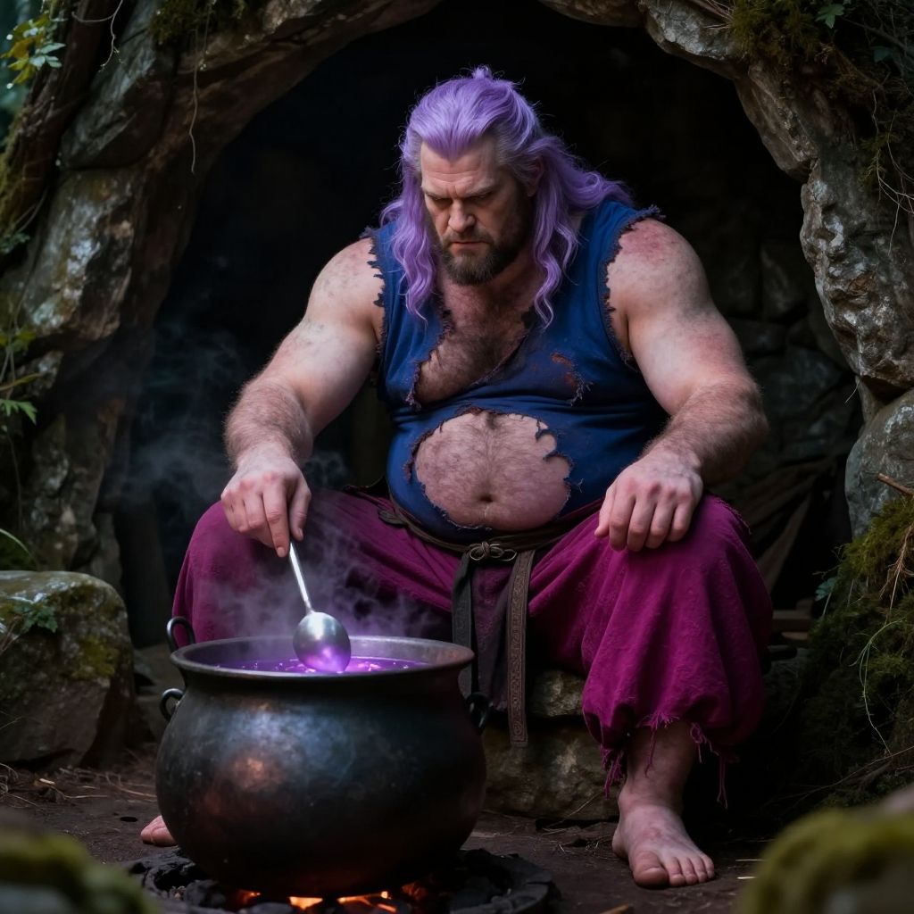 Photograph of a muscular, white male with long, purple-streaked hair, sitting in a dark, rocky cave. He wears a tattered, sleeveless blue shirt with a large hole revealing his chest, and red, ragged pants. His skin is pale and he has a beard. He is stirring a black pot with a glowing purple spoon, emitting steam, while sitting on the ground. The cave entrance is framed by moss-covered rocks. The lighting is dim, highlighting his intense, focused expression. The background is dark and shadowy, with faint greenery visible. The overall mood is mystical and primal.