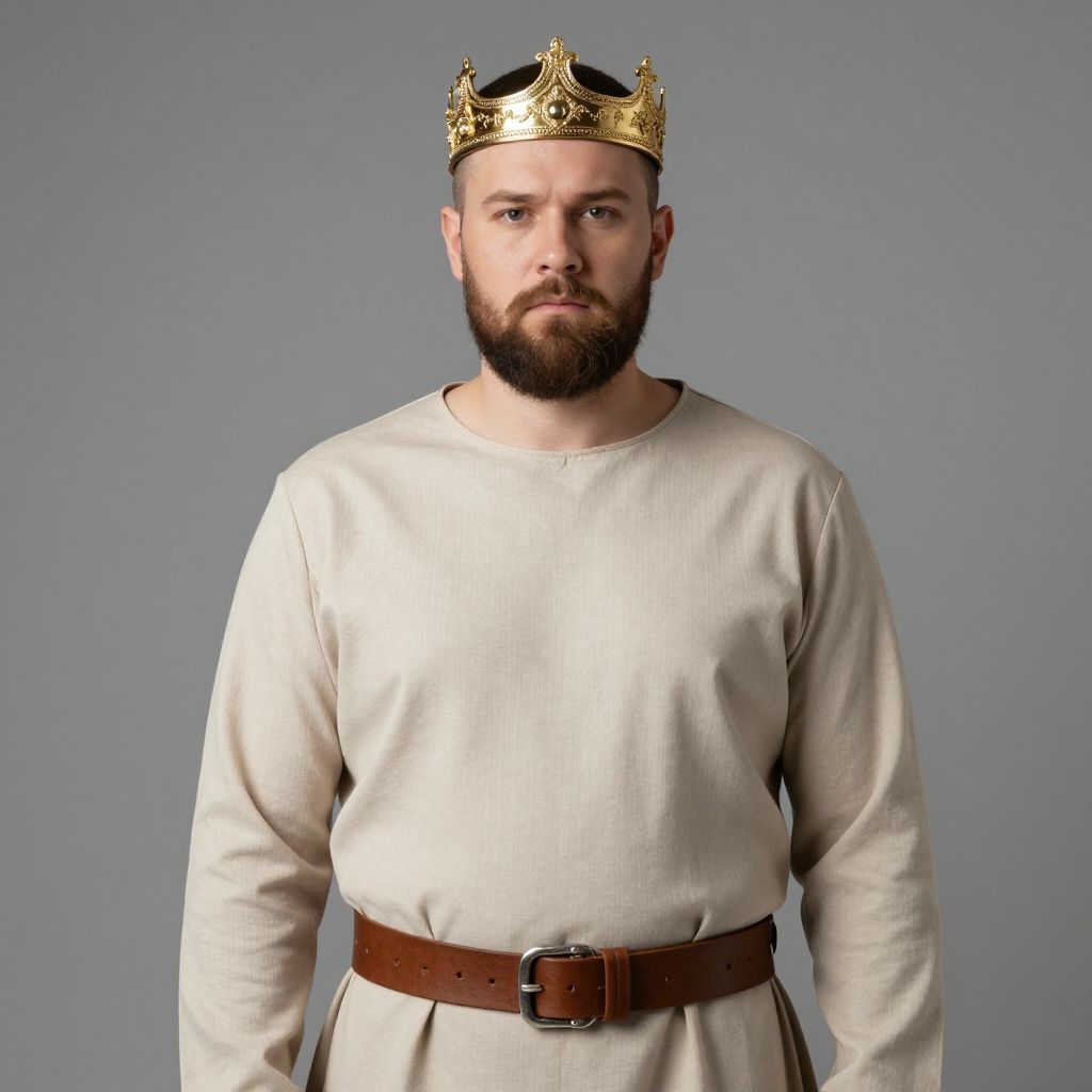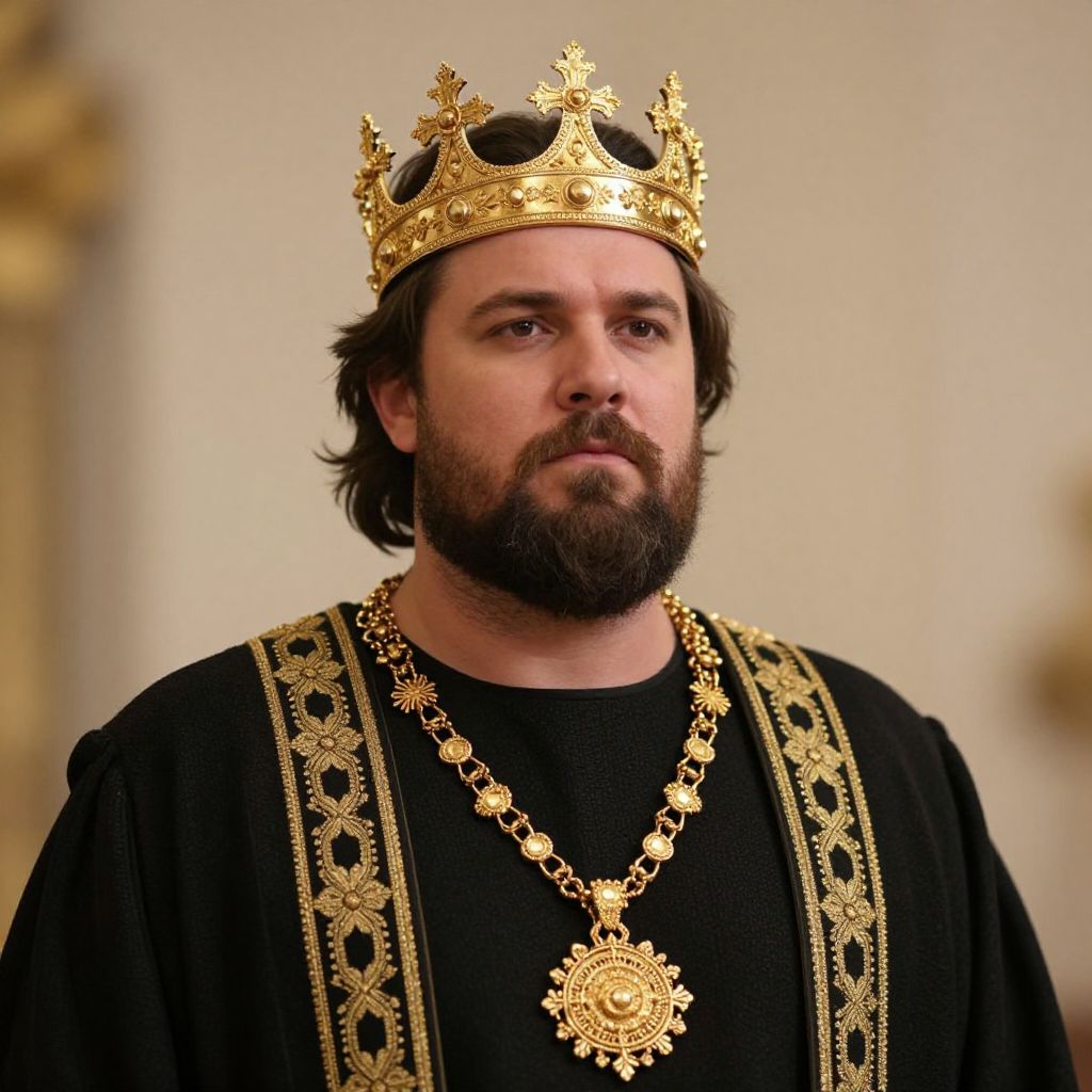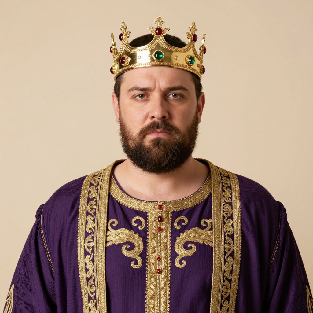 Photograph of a serious-looking man with a dark beard wearing a golden crown adorned with red and green jewels. He's dressed in a rich purple robe with intricate gold embroidery. The background is a plain, light beige. The man has a medium build and a slight frown, with his gaze directed straight at the camera. The image has a formal, regal feel.